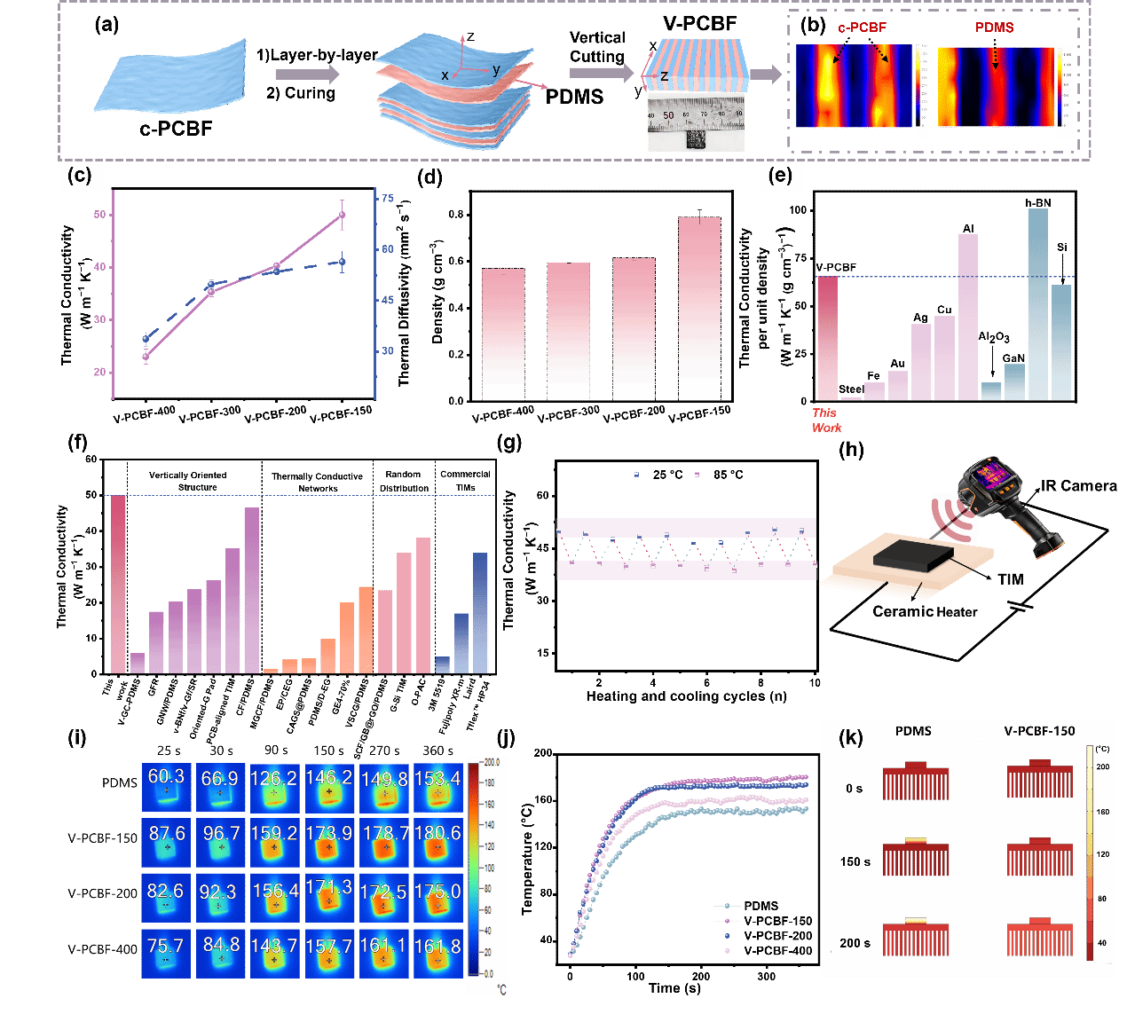 (3)通过逐层组装重构为垂直取向的热界面材料时,其垂直向热导率可达50.2 W/(m·K),在散热测试中90 s内可实现125.5 ℃的显著温降,具有出色的热管理性能。