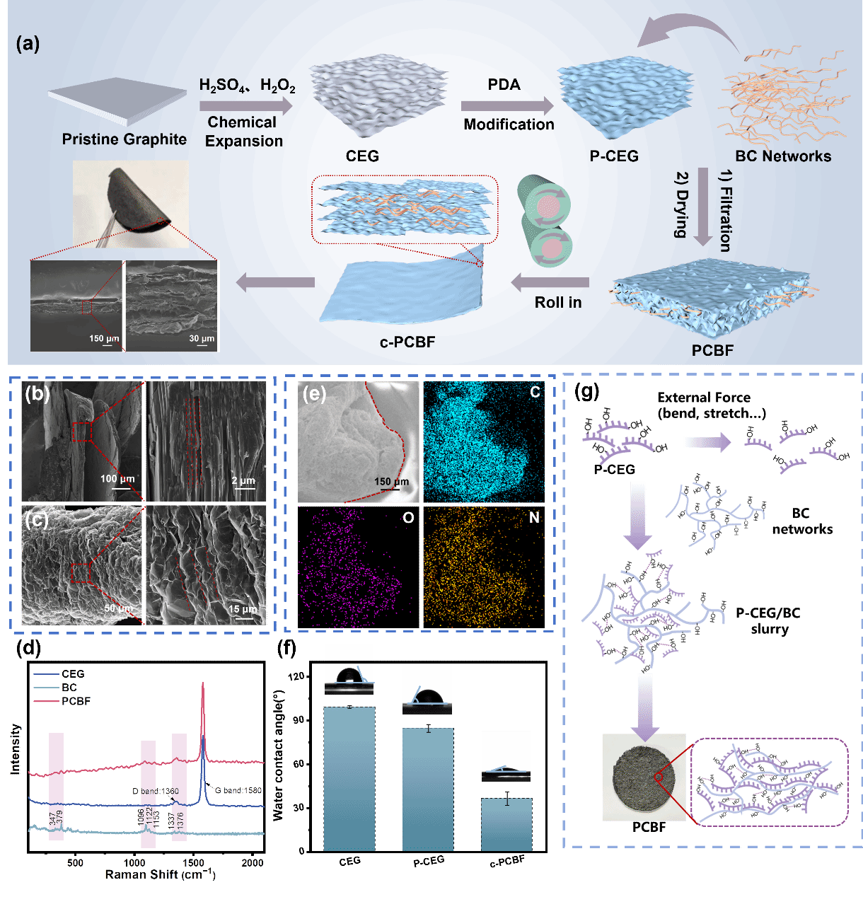 (1)制备方法避免了传统高强度剥离对CEG本征结构的破坏,保留了其连续的声子/电子传输路径,同时利用细菌纤维素的机械缠结与聚多巴胺增强的氢键作用增强整体力学性能。