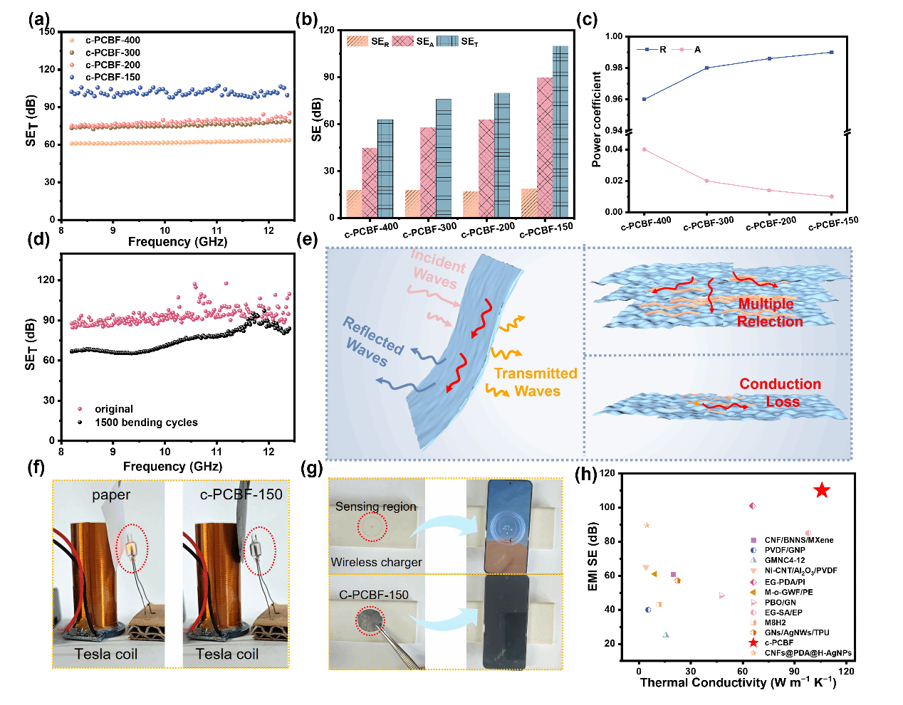 (2)材料展现出卓越的综合性能:电导率达474 S·cm−1,电磁屏蔽效能达110 dB,热导率达105.8 W/(m·K),在无线充电系统中表现出优异的电磁屏蔽效果。